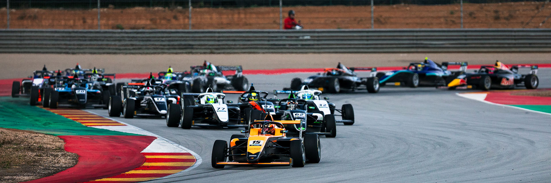 The first race of the Aragon weekend began in dry conditions, though the clouds overhead portended the likelihood of a shift in conditions. Thomas Bearman started the race from pole for Van Amersfoort Racing, alongside US Racing’s Ary Bansal. Van Langendonck started the race from third, joined on row two by Samuel Ifrid (CRAM), who achieved his best starting position of the season so far. As the race began, the top three remained solidly in their positions, while Ifrid was under pressure from US Racing’s Oleksandr Savinkov. Heading down to the corkscrew for the first time, Savinkov tapped the rear of Ifrid, sending the Swiss driver spinning to the rear of the pack. In the aftermath of this moment, Aleksander Ruta moved up to fourth, and broke away from the rest of the field along with the top three.